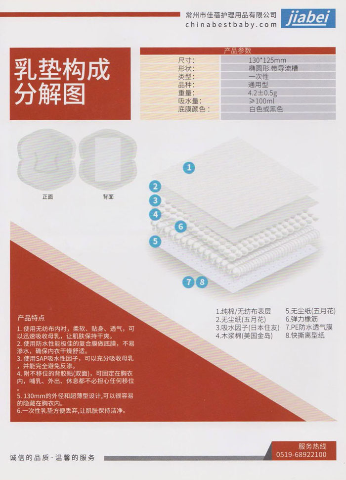常州市佳蓓護理用品有限公司是一家專業(yè)從事開發(fā)、生產(chǎn)、銷售并具備自營出口的外向型企業(yè),主要生產(chǎn)“一次性防溢乳墊“,以質(zhì)量穩(wěn)定,柔軟親膚而深受客戶和消費者青睞。本公司產(chǎn)品從生產(chǎn)到包裝成品嚴格執(zhí)行無菌生產(chǎn)標準化流程,并和設(shè)備生產(chǎn)廠家合作開發(fā)了兩條從進料、生產(chǎn)、檢測、滅菌、成品包裝的無菌生產(chǎn)線,從而實現(xiàn)了真正意義上的無菌生產(chǎn)標準化。 佳蓓秉承”用戶至上“的原則,期待與國內(nèi)外客戶真誠合作,同時也誠邀品牌公司貼牌合作,歡迎您的蒞臨和指導(dǎo),與我們攜手合作,共創(chuàng)未來。