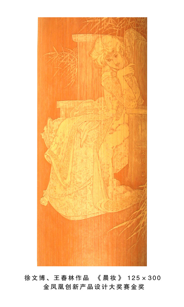 得獎情況 1、扇形擺件《花鳥》2004年9月太湖博覽會金獎 2、《蘭亭序》2008年11月江蘇藝博杯工藝美術(shù)精品獎銀獎 3、《雄風(fēng)圖》2008年11月江蘇藝博杯工藝美術(shù)精品獎創(chuàng)意獎 4、《靜音》2008年11月“天工藝苑•百花杯”中國工藝美術(shù)精品獎銀獎 5、《人物》2008年12月中國收藏藝術(shù)精品博覽會金獎 6、《花鳥》200 8年12月中國收藏藝術(shù)精品博覽會銀獎 7、《青竹鳥語》2008年12月中國收藏藝術(shù)品博覽會“入圍收藏品” 8、《吉祥富貴》2009年3月“金鳳凰”創(chuàng)新產(chǎn)品設(shè)計大獎賽金獎 9、《黃山云海》2009年10月江蘇藝博杯工藝美術(shù)精品獎金獎 10、《花鳥》2009年10月第二屆江蘇旅游商品博覽會最佳產(chǎn)品獎 11、《秋菊圖》2009年11月“天工藝苑•百花杯”中國工藝美術(shù)精品獎銀獎 12、《秋鷹圖》2010年3月“金鳳凰”創(chuàng)新產(chǎn)品設(shè)計大獎賽優(yōu)秀獎 13、《花鳥四屏》2010年3月“金鳳凰”創(chuàng)新產(chǎn)品設(shè)計大獎賽銅獎 14、《荷塘清暑》2010年5月深圳國際文化產(chǎn)業(yè)博覽交易會銅獎 15、《溪山煙云圖》2010年9月江蘇藝博杯工藝美術(shù)精品大獎賽金獎 16、《高士臨風(fēng)圖》2010年10月“天工藝苑•百花杯”中國工藝美術(shù)精品獎銀獎 17、《溪山煙云圖》2010年11月第二屆東方工藝美術(shù)之都博覽會“迎春花獎” 18、《深山尋隱圖》2011年3月“金鳳凰”產(chǎn)品設(shè)計大獎賽銅獎 19、《欣欣向榮》2011年5月深圳國際文化產(chǎn)業(yè)博覽交易會金獎 20、《江崖遠(yuǎn)眺圖》2011年9月江蘇藝博杯工藝美術(shù)精品大獎賽金獎 21、《富春山居圖》2011年10月“天工藝苑•百花杯”中國工藝美術(shù)精品獎金獎 22、《深山訪友》2011年11月中國無錫國際文化藝術(shù)博覽會銀獎 23、《幽谷清音》2012年3月“金鳳凰”創(chuàng)新產(chǎn)品設(shè)計大獎賽銅獎 24、《群芳競艷》2012年10月“儒仕儒家、百花杯”中國工藝美術(shù)精品博覽會金獎 25、《山村渡口圖》2012年12江蘇藝博杯工藝美術(shù)精品大獎賽金獎。 26、《晨妝》2013年4月“金鳳凰”創(chuàng)新產(chǎn)品設(shè)計大獎賽金獎。 27、《和風(fēng)圖》2013年6月中國(青島)工藝美術(shù)博覽會創(chuàng)新產(chǎn)品設(shè)計大賽金獎。 28、《松壑聽泉》2013年9月江蘇藝博杯工藝美術(shù)精品大獎賽銀獎。 29、《君子圖》2013年11月“國信•百花杯”中國工藝美術(shù)精品獎銀獎 30《碧水輕舟》2014年5月深圳國際文化產(chǎn)業(yè)博覽交易會銀獎。 31、《千巖萬壑圖》2014年10月“中國原創(chuàng)•百花杯”中國工藝美術(shù)精品獎金獎 32、《溪山訪友圖》2014年10月江蘇藝博杯工藝美術(shù)精品大獎賽銀獎 33、《深山云壑》2014年12月深圳冬季國際文化產(chǎn)業(yè)博覽交易會金獎 34、《鷹》2015年深圳文化產(chǎn)業(yè)博覽交易會獲“中國工藝美術(shù)文化創(chuàng)意獎”金獎