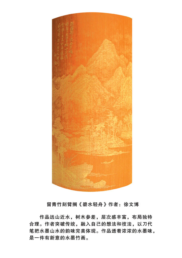 徐博(藝名文博),1973年生,江蘇武進(jìn)人,江蘇省省名人,高級工藝美術(shù)師,常州市留青竹刻非遺傳承人,常州工藝美術(shù)家協(xié)會理事,被譽為當(dāng)今中國最具創(chuàng)新意識的新銳竹刻家代表,多次獲得國家工藝美術(shù)大獎?釔哿羟嘀窨痰男煳牟┵p竹為樂,以竹詠志,借竹抒懷,悉心探索留青竹刻的藝術(shù)表現(xiàn)。在中國工藝美術(shù)大師蕭劍波的精心指導(dǎo)下,開創(chuàng)留青水墨山水之技法,更好的體現(xiàn)了竹刻淡雅清秀的藝術(shù)風(fēng)格,并不斷汲取書畫、攝影、雕塑等藝術(shù)精華,不斷滋養(yǎng)藝術(shù)情趣,提升擴展胸襟人格的同時也逐步形成了其形神兼?zhèn)洌搶嵪嗌,氣韻生動的藝術(shù)特點,作品為眾多的國內(nèi)外收藏家珍藏。