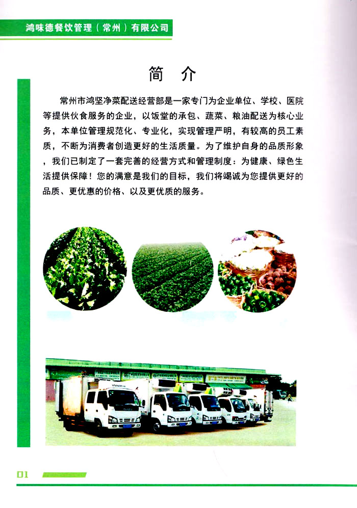 鴻味德餐飲管理(常州)有限公司是一家專門為企業(yè)單位、學校、醫(yī)院等提供伙食服務的企業(yè),以飯?zhí)玫某邪⑹卟、糧油配送為核心業(yè)務,本單位管理規(guī)范化、專業(yè)化,實現管理嚴明,有較高的員工素質,不斷為消費者創(chuàng)造更好的生活質量。為了維護自身的品質形象,我們已制定了一套完善的經營方式和管理制度:為健康、綠色生活提供保障!您的滿意是我們的目標,我們將竭誠為您提供更好的品質、更優(yōu)惠的價格、以及更優(yōu)質的服務。