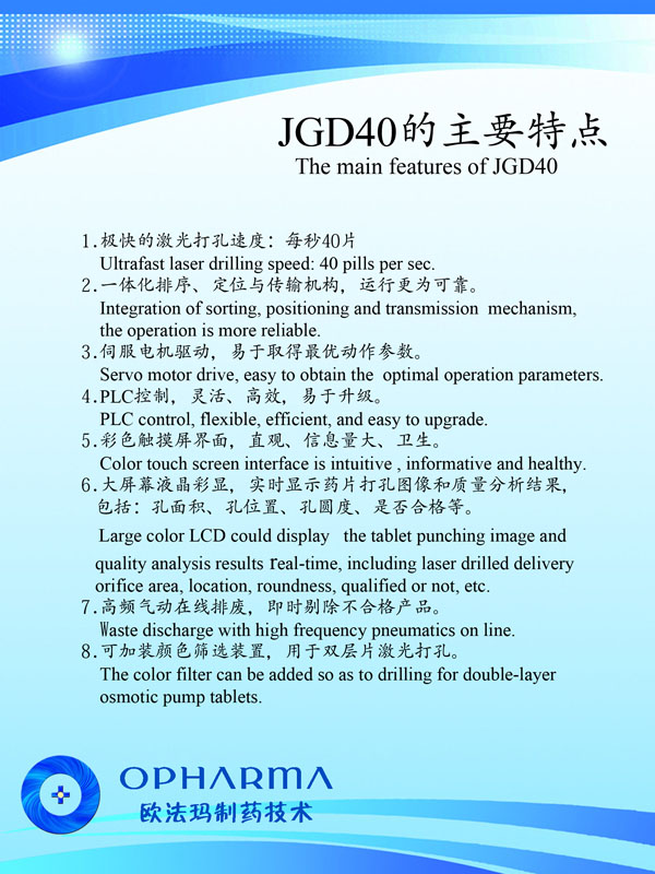 常州歐法瑪制藥技術(shù)有限公司位于長(zhǎng)江三角洲黃金腹地——常州。地理位置優(yōu)越、交通便捷,由鐵路、公路、水路、民航形成了一張立體交叉的交通網(wǎng)絡(luò)。 公司創(chuàng)建于2013年,是一家集研發(fā)、生產(chǎn)和銷售為一體,專業(yè)從事高速激光打孔機(jī)、滲透泵制劑研發(fā)、生產(chǎn)和銷售。目前公司擁有員工20人,科技研發(fā)和技術(shù)人員占員工總數(shù)80%以上,其中本科以上學(xué)歷占80%以上。 公司始建以來(lái),以前瞻的科學(xué)規(guī)劃,通過(guò)自主研發(fā),解決了高速激光打孔機(jī)諸多的世界難題,使之達(dá)到40片/秒以上且精確打孔的國(guó)際領(lǐng)先水平;同時(shí)開(kāi)發(fā)廢片自動(dòng)識(shí)別、剔除功能,以滿足客戶的實(shí)際所需。公司與瑞士等國(guó)家研究機(jī)構(gòu)的科技合作,以高速激光打孔機(jī)為基礎(chǔ),建設(shè)了滲透泵制劑研發(fā)和中試生產(chǎn)車間,開(kāi)發(fā)了多種藥物的滲透泵制劑,形成了從關(guān)鍵設(shè)備研制,新制劑開(kāi)發(fā)、工藝配套,到批量生產(chǎn)測(cè)試的滲透泵制劑開(kāi)發(fā)全過(guò)程技術(shù)團(tuán)隊(duì)和研究設(shè)施。公司瞄準(zhǔn)現(xiàn)代新型釋藥系統(tǒng),吸收國(guó)內(nèi)外高端人才,努力開(kāi)拓控緩釋技術(shù)、靶向給藥技術(shù)及智能給藥技術(shù)。 2013年公司被評(píng)為黑馬大賽“創(chuàng)業(yè)組50強(qiáng)”、“領(lǐng)軍人才創(chuàng)業(yè)重點(diǎn)企業(yè)”;2014公司通過(guò)了IS09001-2008質(zhì)量管理體系認(rèn)證、CE認(rèn)證、江蘇省質(zhì)量信得過(guò)企業(yè)。
