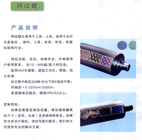 常州市武進區(qū)禮嘉鎮(zhèn)萬超機械有限公司專業(yè)生產(chǎn)、加工花輥、鏡面輥、無紡布設備,及各類機械配件。產(chǎn)品廣泛應用于金屬、塑料、皮革、紙張、玻璃、木材、無紡布、衛(wèi)生材料、包裝裝潢等行業(yè)。 公司經(jīng)營方針:服務鍥而不舍 品質力臻卓越。得到國內眾多客戶的厚愛與好評。 歡迎各界朋友蒞臨常州萬超機械有限公司指導和業(yè)務洽談。 萬超為顧客免費打樣、并代客壓紋!