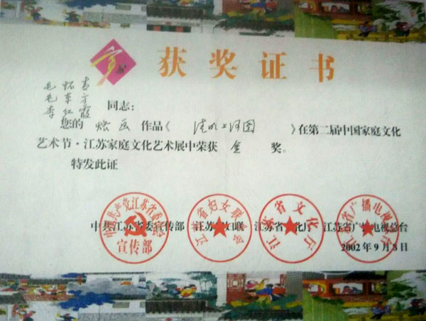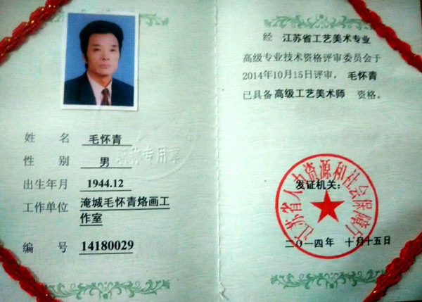 毛懷青,江蘇常州市武進(jìn)人。 中國(guó)工藝美術(shù)學(xué)會(huì)會(huì)員,常州市中國(guó)烙畫(huà)研究會(huì)副會(huì)長(zhǎng),常州市文博鑒賞協(xié)會(huì)理事,非物質(zhì)文化遺產(chǎn)烙畫(huà)傳承人。高級(jí)工藝美術(shù)師。 年輕時(shí)學(xué)習(xí)國(guó)畫(huà)、油畫(huà)中年蔓現(xiàn)掌州咯畫(huà)源遠(yuǎn)流長(zhǎng)、歷史悠久,有著其它美術(shù)門(mén)類(lèi)不具備的藝術(shù)風(fēng)格與特色?芍^是工藝美術(shù)中的一朵十分亮麗的藝術(shù)奇葩,是我民族先人給我們留下的一份不可多得十分珍貴的一份文化遺產(chǎn)。為弘揚(yáng)與發(fā)展這份優(yōu)秀文化遺產(chǎn),我從此下定決心研究烙畫(huà),愿付出一份力量為振興烙畫(huà)事業(yè)做出貢獻(xiàn)。至今已潛心研究幾十年,取得了可喜的成績(jī),被業(yè)界公認(rèn),社會(huì)關(guān)注與認(rèn)可。有“江南烙畫(huà)第一筆”之美譽(yù)。 近年來(lái),創(chuàng)作的烙畫(huà)作品分別獲得過(guò)全國(guó)、省市級(jí)的金、銀、銅獎(jiǎng)多次。中央電視臺(tái)曾兩次播放過(guò)本人的烙畫(huà)作品,江蘇電視臺(tái)、常州電視臺(tái)也曾多次播放過(guò)本人的作品與烙畫(huà)藝術(shù)生涯,揚(yáng)子晚報(bào)、常州日?qǐng)?bào)、常州晚報(bào)也曾多次報(bào)導(dǎo)過(guò)本人的烙畫(huà)作品,出版物有三種版本都能查閱到介紹本的烙畫(huà)從藝生涯與藝術(shù)業(yè)績(jī)。