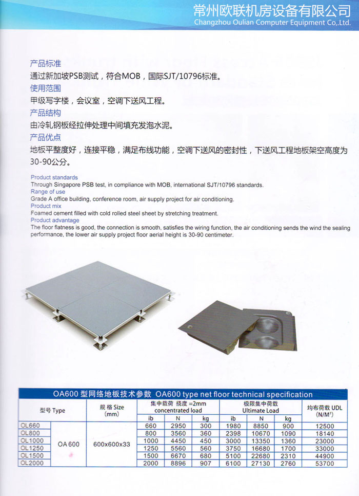 防靜電高架活動(dòng)地板、全鋼地板、陶瓷地板是計(jì)算機(jī)行業(yè)發(fā)展起來(lái)的新型鋪地材料,隔離了潮氣、靜電灰塵,最重要的是解決了綜合布線問題,無(wú)需預(yù)埋管線,可隨時(shí)拆卸、搬移,保證了資訊設(shè)備完整的優(yōu)點(diǎn),適應(yīng)了智能化樓宇中信息自動(dòng)化技術(shù)對(duì)所處環(huán)境的特定要求,避免了廣大客戶的雙重投資,使現(xiàn)代化辦公程度更加高效,辦公場(chǎng)所更加舒適。 “歐聯(lián)”系列全鋼地板,符合國(guó)家安全要求,種類完備多樣,其中防靜電陶瓷地板、硫酸鈣地板等除具有普通瓷質(zhì)的裝飾和實(shí)用性外,其耐磨、防水、防火功能優(yōu)于其它同類產(chǎn)品,防靜電系列地板,能切合不同客戶的要求,其靈活的配置,深受客戶歡迎,不同材質(zhì)的地板結(jié)構(gòu)使設(shè)計(jì)師的設(shè)計(jì)空間比傳統(tǒng)的更加廣闊自由和善變。 公司大力發(fā)展國(guó)內(nèi)外銷售業(yè)務(wù),多次中標(biāo)國(guó)內(nèi)重點(diǎn)工程 ,例:哈爾濱醫(yī)科大學(xué)、山東大學(xué)、上海普通機(jī)場(chǎng)等。 公司將一如既往開發(fā)和制造一流的產(chǎn)品,愿與廣大有識(shí)之士合作發(fā)展,共創(chuàng)美好未來(lái)。