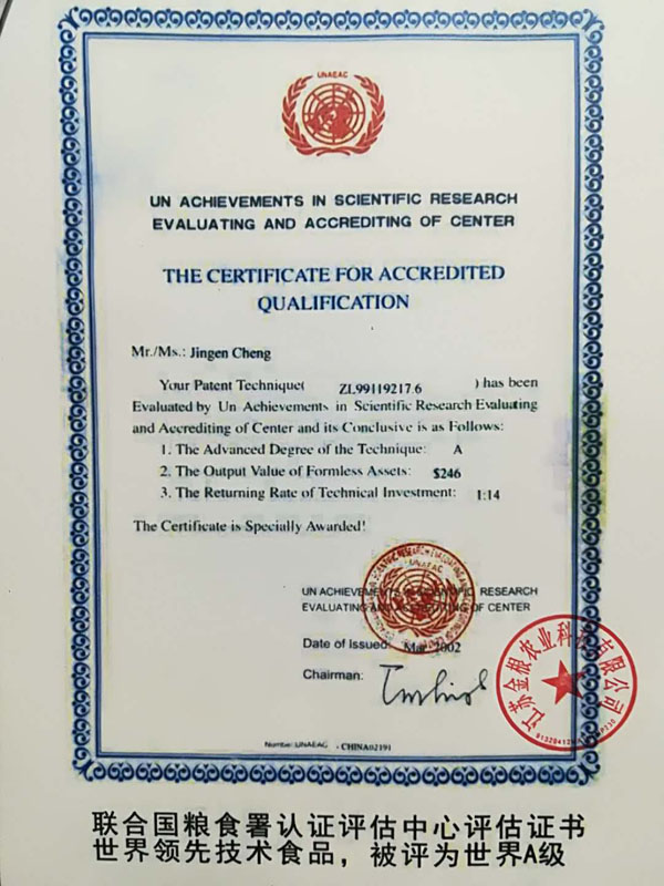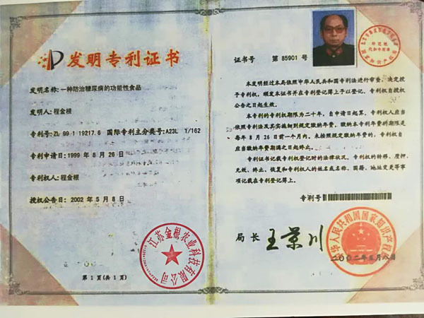 江蘇金根農(nóng)業(yè)科技有限公司是專業(yè)從事無(wú)糖食品、糖尿病、肥胖、和中老年人健康食品的研究、開發(fā)、銷售為一體的現(xiàn)代企業(yè)。 經(jīng)高級(jí)工程師程金根先生盡二十八年研發(fā),以五谷四豆為原料研制出一種特殊的營(yíng)養(yǎng)食品。本產(chǎn)品富含人體所需的有機(jī)微量元素:鉻、硒、鋅、鎂、鋰等,幾十種氨基酸、膳食纖維及其它營(yíng)養(yǎng)物質(zhì)。產(chǎn)品原料是按生態(tài)農(nóng)業(yè)有機(jī)的標(biāo)準(zhǔn)通過(guò)生物工程的種、培植方法,為谷糧增加了多種營(yíng)養(yǎng)成份,按科學(xué)配方生產(chǎn)出“老山仁”系列產(chǎn)品。 本產(chǎn)品原料是在高寒、高濕、旱地等種植,要求施農(nóng)家肥,采用生物治蟲,因此是無(wú)公害的優(yōu)良品種。目前公司有四個(gè)種植基地,分別在江西、江蘇、陜西等地。 一種防治糖尿病功能性食品專利號(hào):ZL99119217.6。 “程金根”系列產(chǎn)品先后獲得二項(xiàng)發(fā)明專利,并經(jīng)聯(lián)合國(guó)科技成果評(píng)估論證為A級(jí)產(chǎn)品,屬世界領(lǐng)先技術(shù)。在韓國(guó)、美國(guó)、香港、德國(guó)分別榮獲新技術(shù)、新產(chǎn)品博覽會(huì)金獎(jiǎng)。 2006年經(jīng)國(guó)家農(nóng)業(yè)部、發(fā)展改革委員會(huì)、聯(lián)合國(guó)糧農(nóng)組織代表、中醫(yī)研究院、中國(guó)科學(xué)技術(shù)協(xié)會(huì)、中醫(yī)藥大學(xué)、農(nóng)業(yè)大學(xué)、農(nóng)學(xué)院、中國(guó)保健協(xié)會(huì)、糧油協(xié)會(huì)、食品研究所等十幾位專家對(duì)該專利產(chǎn)品做了評(píng)估論證,一致認(rèn)為該項(xiàng)技術(shù)先進(jìn)產(chǎn)品突出、食用安全,并給予很高的評(píng)價(jià)。 論證意見: 1、這項(xiàng)專利技術(shù)填補(bǔ)了國(guó)內(nèi)糖尿病特種功效食品的專用品種和栽培技術(shù)空白。 2、采用有機(jī)食品技術(shù),并以有機(jī)農(nóng)產(chǎn)品為原料加工特種營(yíng)養(yǎng)食品,提高了產(chǎn)品的安全性。 3、用鉻、硒、鋅、鎂、鋰生物強(qiáng)化栽培技術(shù)已獲得發(fā)明專利,為國(guó)際先進(jìn)水平。 4、經(jīng)過(guò)10多年的應(yīng)用實(shí)踐,進(jìn)一步證明了通過(guò)飲食調(diào)理,可預(yù)防糖尿病,對(duì)已患糖尿病者有緩解和預(yù)防糖尿病綜合癥的功效。 “程金根”系列產(chǎn)品具有低脂肪、低熱量、高蛋白、富含各種微量元素(鉻、硒、鋅、鎂、鋰)、高膳食纖維、具有抗氧化、增加免疫力等特點(diǎn),經(jīng)常食用有利于膳食營(yíng)養(yǎng)平衡,是糖尿病、肥胖和中老年人、亞健康群體最佳的健康食品。