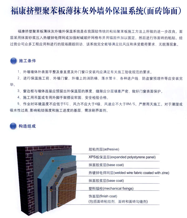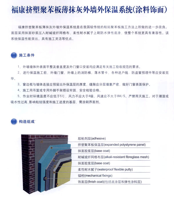 常州市福康新型建材有限公司是以研制開發(fā)、生產(chǎn)、銷售、施工、技術服務為一體的化學建筑材料的專業(yè)企業(yè),通過與歐洲著 名建筑材料公司和國內(nèi)權威科研機構合作,并聘請國家級專家為技術顧問,開發(fā)出適合我國市場的?礒PS、XPS及聚苯顆粒外墻外保溫節(jié)能系統(tǒng)。 公司的生產(chǎn)線全部采用國內(nèi)先進的電腦控制自動化設備,配備了專業(yè)的實驗中心,并且采用進口的可再分散乳膠粉為基料,確保?低鈮ν獗毓(jié)能系統(tǒng)具有性能優(yōu)異、安全可靠,綠色環(huán)保、適用性強的高品質特點。 公司開發(fā)的\'?低鈮ν獗叵到y(tǒng)\'被列為江蘇省科技成果推廣項目。整個生產(chǎn)流程依照質量體系的要求,實行嚴格的監(jiān)控和檢測,為生產(chǎn)優(yōu)質產(chǎn)品提供保證。高品質的?低鈮ν獗叵到y(tǒng),提供從熱工設計、產(chǎn)品開發(fā)、生產(chǎn)銷售及工程施工全程服務的一體化解決方案。 公司本著“綠色環(huán)保、節(jié)約能源、造福人類”的理念。用我們一流的產(chǎn)品和優(yōu)秀的服務,打造出一個個節(jié)能康居示范工程,為人類營造出舒適健康的居住環(huán)境。我們愿為中國節(jié)能事業(yè)的發(fā)展積極努力,更上一層樓。 公司組建高效的生產(chǎn)經(jīng)營管理模式,設立專業(yè)技術服務機構。配備售后的優(yōu)質服務。實行原材料、運輸、安裝一條龍服務。經(jīng)本公司施工之后,貴公司可以直接批涂料、裝門窗、貼瓷磚,保證絕無任何質量問題。
