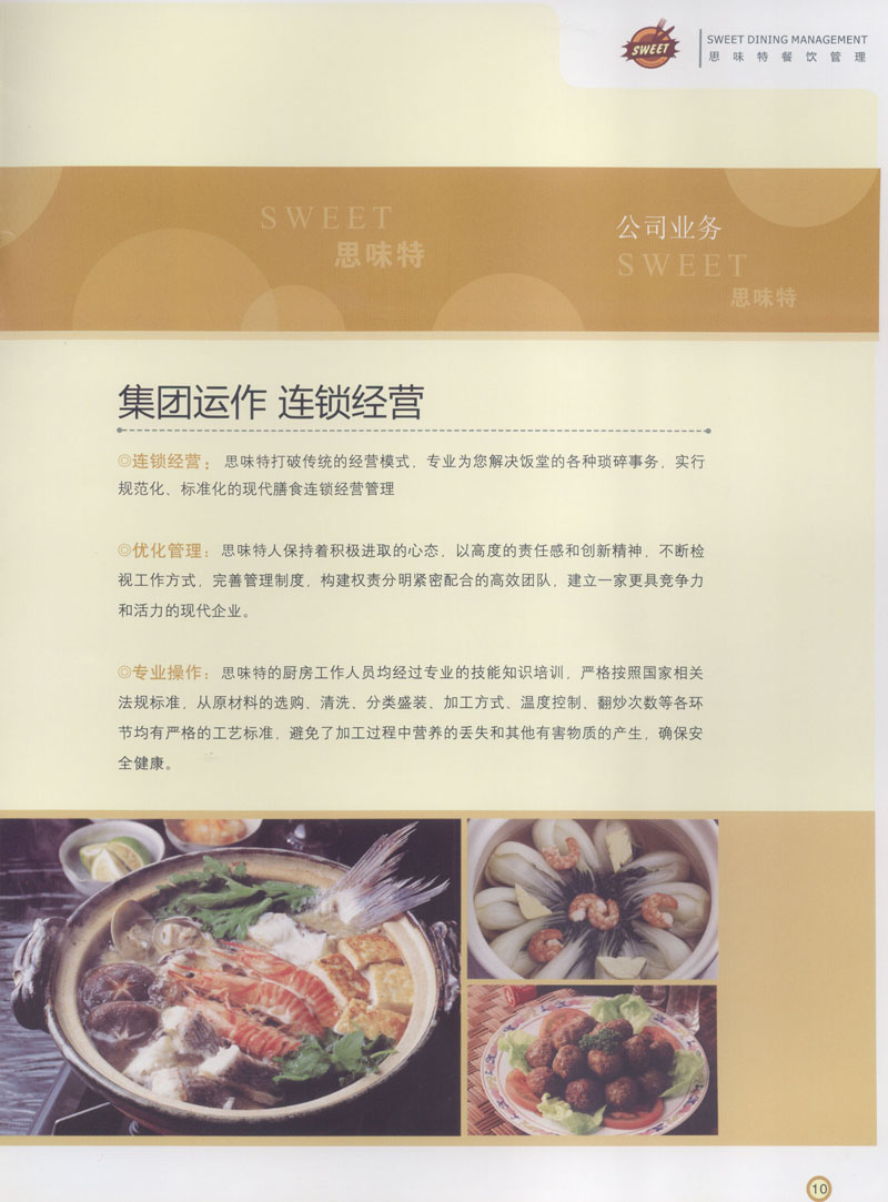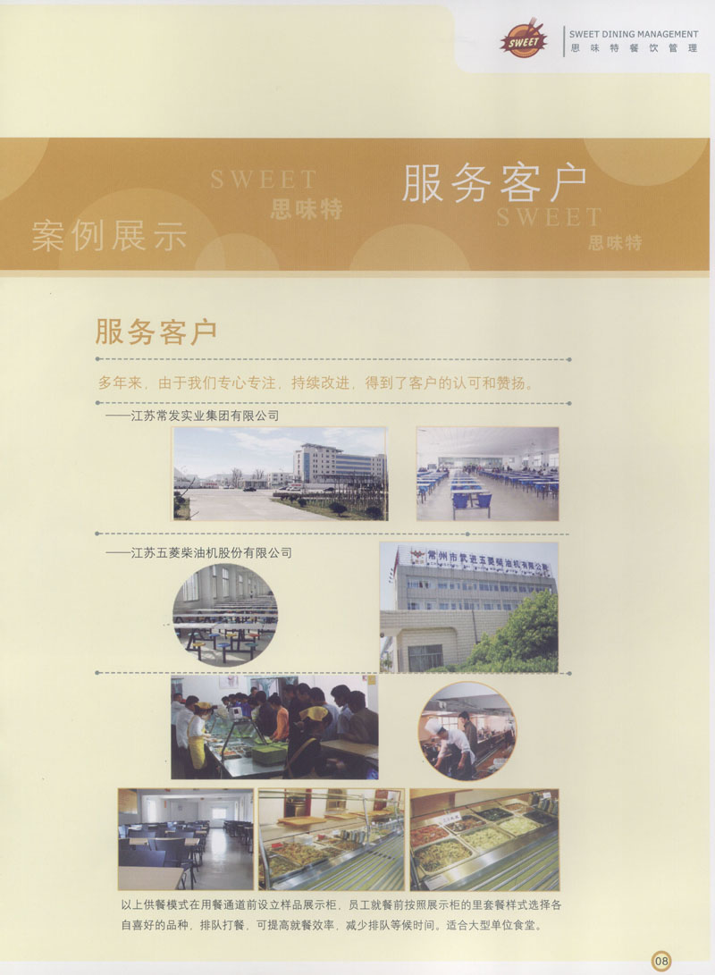 常州市思味特餐飲有限公司是一家專業(yè)從事企事業(yè)后勤服務(wù)的有限責(zé)任公司,公司從承包食堂起步,逐漸發(fā)展為經(jīng)營(yíng)團(tuán)膳承包、營(yíng)養(yǎng)送餐、生活區(qū)管理、連鎖餐廳的綜合型企業(yè)。2008年公司斥資100萬(wàn)元,在常州興建了可以同時(shí)提供3000餐膳食的中央廚房,重點(diǎn)打造“和美客”后勤服務(wù)品牌,全力為企事業(yè)單位解決后勤后顧之憂。 到目前為止,我們合作成功的企事業(yè)單位超過50多家,服務(wù)人數(shù)突破15萬(wàn),合作單位包括國(guó)家機(jī)關(guān)、國(guó)有企業(yè)、三資企業(yè)、民營(yíng)企業(yè)、學(xué)校、醫(yī)院等,其中不乏國(guó)際知名品牌公司。 和美客愿為更多的國(guó)內(nèi)外企事業(yè)單位及機(jī)關(guān)團(tuán)體分憂解難,從廚房設(shè)計(jì)、菜品配送、團(tuán)膳承包、到生活區(qū)管理等提供全方位的服務(wù)。