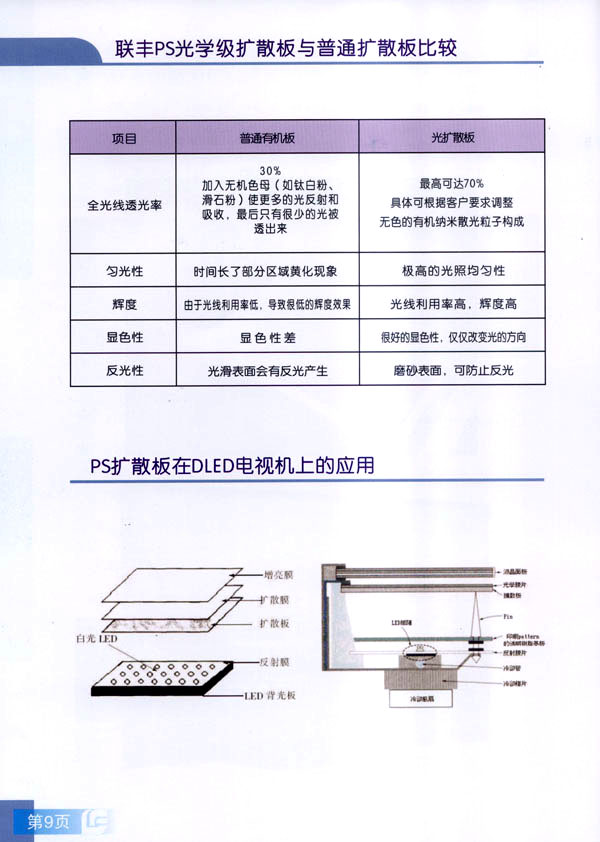 聯(lián)豐生產(chǎn)的VFP系列PS擴(kuò)散板能廣泛應(yīng)用于直下式LED,CCFL液晶電視背光模組。產(chǎn)品在很多國(guó)內(nèi)一線TV的背光模組上使用。產(chǎn)品具有高輝度,高擴(kuò)散性,特別適用于超薄背光模組的擴(kuò)散部件,能有效降低成本,節(jié)約能源。