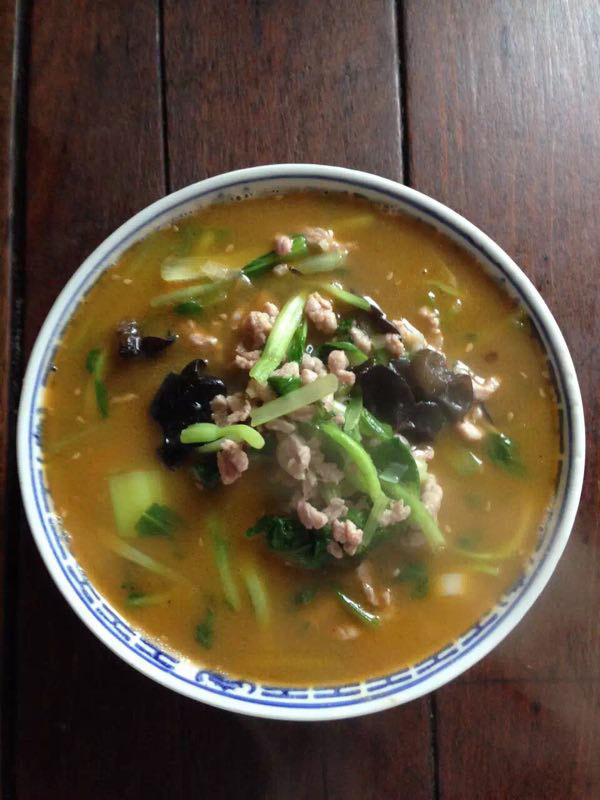 武進(jìn)區(qū)青城面館經(jīng)營面積280平方米左右,主要特色是現(xiàn)炒肉絲,素菜蓋澆面,面館創(chuàng)始人今年63歲的王蘭珍,她對(duì)美食有著高于常人的悟性。她開過饅頭店,開過小飯館,承包過食堂,燒菜、取料樣樣在行,吃過的人常常贊不絕口。 20世紀(jì)初,在跟德興面館的老師傅學(xué)了做面手藝后,王蘭珍萌生了開一家面館的想法,除了可以養(yǎng)家糊口,最重要的是想讓更多人嘗嘗自己的手藝。于是,她在自己的住處擺起了幾張桌椅,面館就算正式營業(yè)了。因?yàn)榧易∏喑菢,王蘭珍干脆取名“青城面館”。 “從早上5點(diǎn)多開始營業(yè),到下午1點(diǎn)多打烊,一天至少要賣掉300多碗面,用掉近160斤面粉。”為何青城面館的面條如此受歡迎,兒媳婦陸偉紅說秘訣在于湯頭和澆頭。湯頭分白湯和紅湯,白湯是由10斤豬骨頭熬制而成,湯色清澈而味道濃郁;紅湯以骨頭湯作底湯,加入茴香、甘草、草果等20多種中草藥,以及糖、醬油等調(diào)味品,鮮而不腥,散發(fā)出陣陣香味。 和一般面館事先燒制好澆頭,放在盆里供客人選擇不同,青城面館的澆頭都是一份份現(xiàn)炒的,特別講究食材的新鮮。就拿暢銷的肉絲蔬菜紅湯面來說,要先起猛火,把肉絲、木耳、蘑菇、青菜等食材放一起煸炒至香,然后澆在撈起的面條上。一碗面出來,現(xiàn)炒的澆頭與面條融合,味道香郁至極。 遙觀人的早晨,醒得有些早。對(duì)很多遙觀人來說,美好的一天是從青城面館開始的。那一碗碗現(xiàn)炒的蓋澆面,筋道爽滑、醬香味濃,溫存著他們的胃與記憶,帶來刻進(jìn)骨子里的家鄉(xiāng)味道。