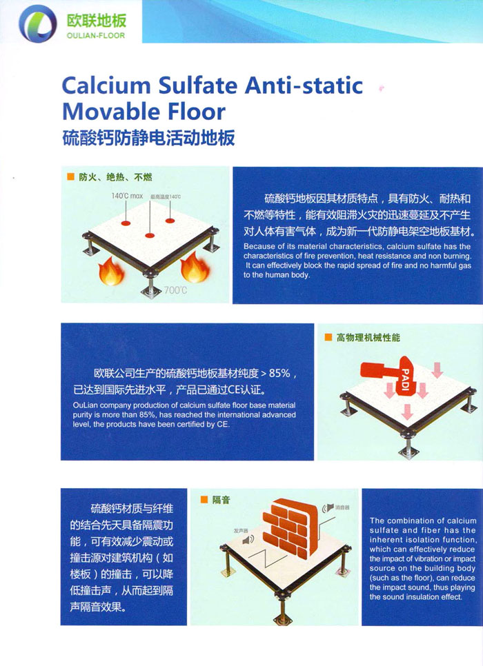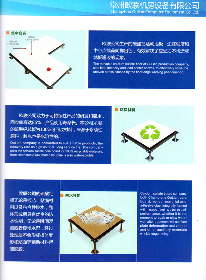 “歐聯(lián)”系列全鋼地板,符合國家安全要求,種類完備多樣,其中防靜電陶瓷地板、硫酸鈣地板等除具有普通瓷質(zhì)的裝飾和實用性外,其耐磨、防水、防火功能優(yōu)于其它同類產(chǎn)品,防靜電系列地板,能切合不同客戶的要求,其靈活的配置,深受客戶歡迎,不同材質(zhì)的地板結(jié)構(gòu)使設(shè)計師的設(shè)計空間比傳統(tǒng)的更加廣闊自由和善變。