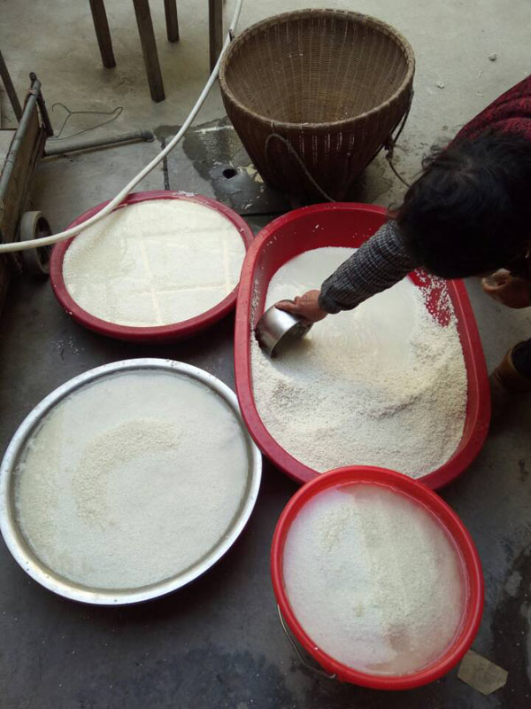 第三步:拌入酒曲,這時候才發(fā)現(xiàn)了“木桶”的神奇之處:一頭空,另一頭也是空,只不過用鋼筋做了個柵欄。之前蒸米飯,老徐是墊上了蒲草,一方面讓糯米飯更易熟,另一方面也增加了糯米飯的清香氣息。把糯米飯倒入蠶匾中,邊翻動糯米飯邊撒上酒曲,使酒曲與糯米飯充分拌勻。
