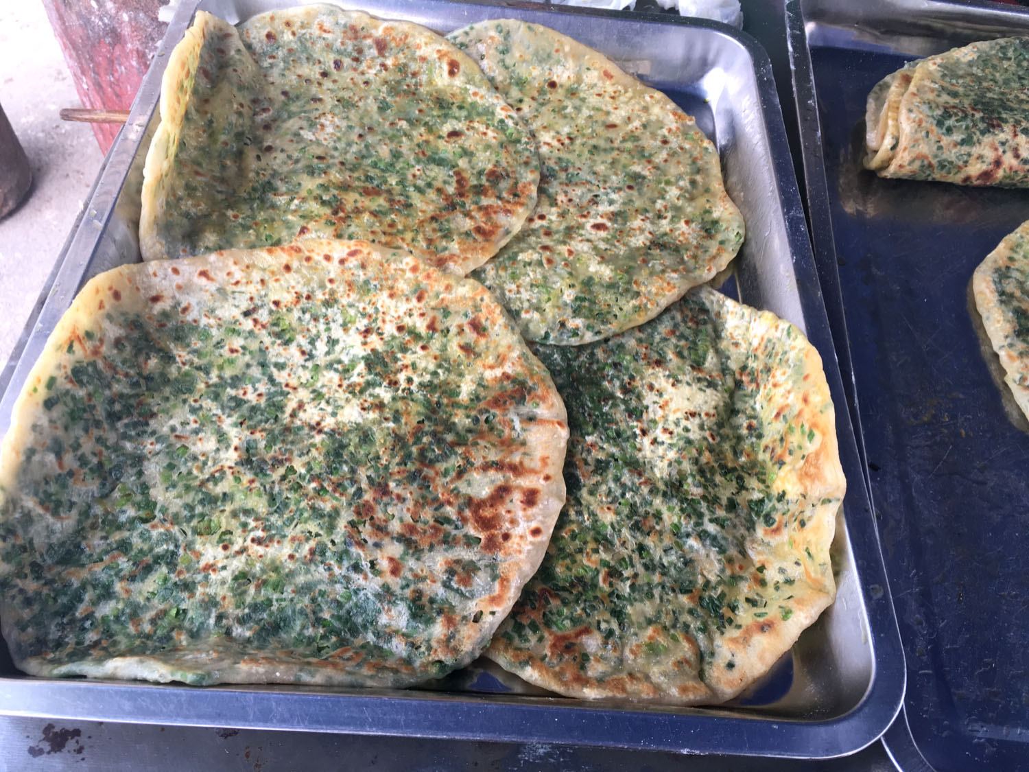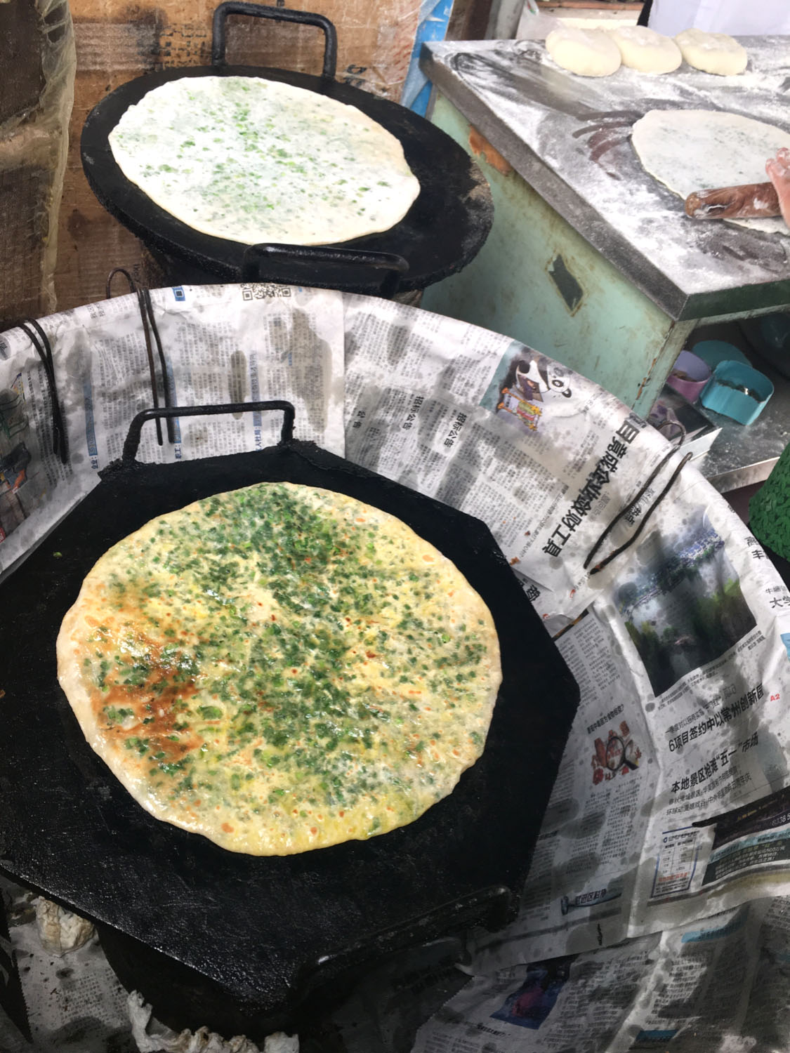 油酥餅(圖3-4)、糍團(tuán)餅(圖5-6)、韭菜餅(圖7-8)   油酥餅每天晚上做,涼了更好吃,更酥更脆,里面都是很香的黑芝麻;糍團(tuán)餅,每天中午擺攤熱了煎鍋開始煎,糯米做成,用菜籽油煎至金黃,餡兒是黑芝麻瓜子仁;韭菜餅是最受歡迎的,每天都有好多人排隊(duì)來買。供應(yīng)時(shí)間:每年的4月份到11月份 下午1點(diǎn)到5點(diǎn)半。