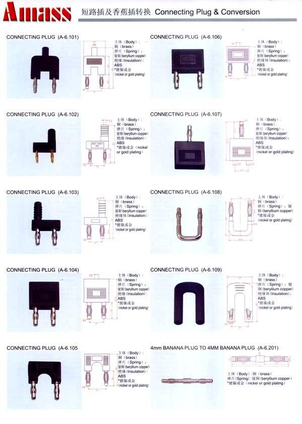 本公司專業(yè)生產(chǎn)各類香蕉插頭,香蕉插座,接線柱,電瓶夾,鱷魚夾,測試導(dǎo)線,測試筆等。產(chǎn)品分2mm/2.5mm/3mm/3.5mm/4mm五大系列,百余種款式, 各種香蕉插廣泛用于儀器、儀表、電力測試、教學(xué)、玩具,視聽設(shè)備、醫(yī)療儀器,保健產(chǎn)品等領(lǐng)域。公司技術(shù)力量雄厚,生產(chǎn)工藝先進(jìn),產(chǎn)品遠(yuǎn)銷港、臺(tái)、歐美,并與飛利浦等國際品牌配套。公司本著精益求精的理念,歡迎新老客戶光臨。 我們擁有資深的工程師和豐富的電子產(chǎn)品銷售經(jīng)驗(yàn),專業(yè)生產(chǎn)各類電子接插件產(chǎn)品。 香蕉插頭,香蕉插座,電瓶夾,鱷魚夾等品種齊全、 質(zhì)量可靠,致力服務(wù)于通訊、數(shù)據(jù)通信、消費(fèi)類電子產(chǎn)品、計(jì)算機(jī)和計(jì)算機(jī)外圍設(shè)備以及工業(yè)應(yīng)用等領(lǐng)域,能給客戶提供全面采購解決方案。 我們秉承穩(wěn)健作風(fēng)、誠實(shí)經(jīng)營、合理價(jià)格、完善服務(wù)的宗旨,在全體客戶的支持下,公司不斷創(chuàng)新進(jìn)取,業(yè)績蒸蒸日上,已與數(shù)十家電子零件制造商及其分支機(jī)構(gòu)建立密切合作關(guān)系,在國內(nèi)擁有數(shù)百家固定客戶。