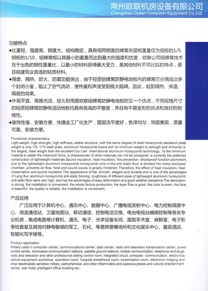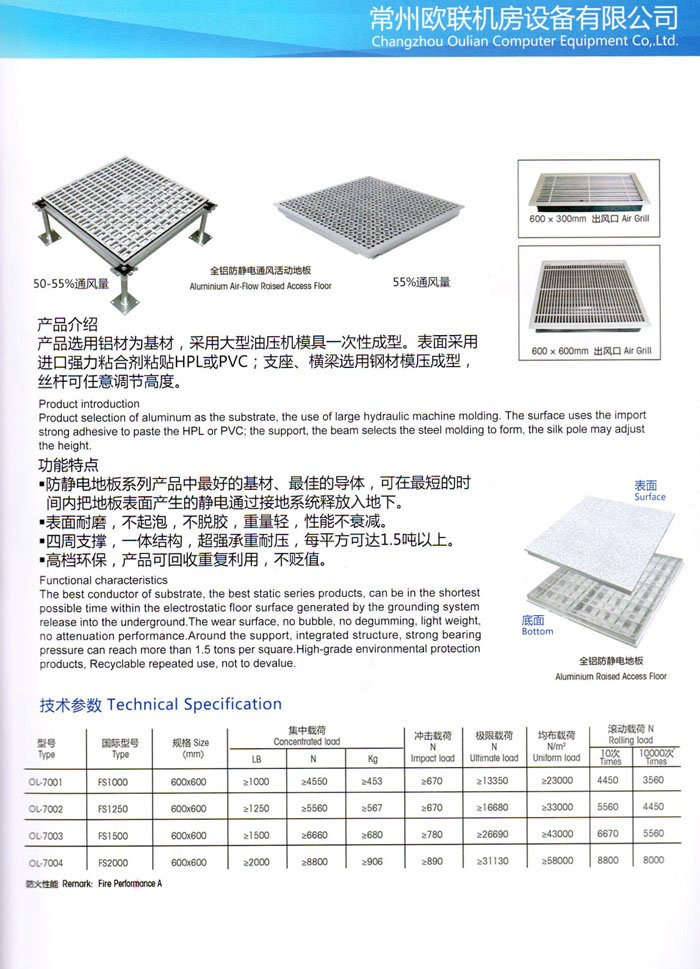 “歐聯(lián)”系列全鋼地板,符合國家安全要求,種類完備多樣,其中防靜電陶瓷地板、硫酸鈣地板等除具有普通瓷質(zhì)的裝飾和實用性外,其耐磨、防水、防火功能優(yōu)于其它同類產(chǎn)品,防靜電系列地板,能切合不同客戶的要求,其靈活的配置,深受客戶歡迎,不同材質(zhì)的地板結(jié)構(gòu)使設(shè)計師的設(shè)計空間比傳統(tǒng)的更加廣闊自由和善變。