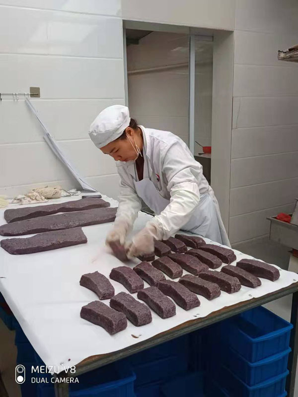 腳踏糕本名“年糕”,按常州周邊地區(qū)的風俗習(xí)慣,在春季前夕,各家各戶都要蒸年糕,吃年糕!案狻敝C音“高”,過年吃年糕被賜予“年年高”,一年高一年,鋒吉祥之意,表達這人們對未來美好生活的憧憬和良好的祝愿。今天小編要帶大家的就是一家至今保持著傳統(tǒng)手工制作的鈺鋒糕點坊。 鈺鋒糕點坊位于常州鄭陸鎮(zhèn)三皇廟范家莊,一個比較偏僻的村莊,雖然這家作坊不大,但香糯絲滑,軟糯適中,韌勁十足的腳踏糕吸引了無數(shù)的食客。制作一條腳踏糕要從淘米,浸泡,碾粉,鋪粉,一層一層的鋪下去,需要無數(shù)道制作工序,這些都是店主孫煥公公老周,憑著幾十年的經(jīng)驗,加上店主孫煥從不馬虎的決心! 這“腳踏”也并非赤腳上陣,而是把蒸好的糕倒入早以準備好的框子里,用布包裹好,上面再用薄膜包好,再蓋上布,再換上專門腳踏的布鞋,踩的時候要勻稱,左右腳要配合好,不然糕會高高低低,不平整,最后再拿蠟燭線拆成一條小長條,再拿帶包裝好,如此又香又糯的腳踏糕就大功告成了。 店主孫煥為了讓更多的人認識和了解常州腳踏糕的傳統(tǒng)文化和美食,她在傳統(tǒng)工藝中增加了適合現(xiàn)代文化的多種口味,她在糕里加入南瓜,紫薯,老紅糖,大麥汁,血糯米,核桃,葡萄干,紅棗等食材,做出五顏六色,純天然的口味,深受食客們的喜愛,不管是送人還是自己吃都非常新穎。 (重陽糕)重陽糕的由來,九九重陽,九是陽數(shù),也是陽數(shù)中最大的數(shù),九月初九,兩九相重,為之重陽,古人有重陽登高的習(xí)俗。高于糕同意,寓意人活九十九,生活步步高,秋景勝春光,夕陽無限好。夕陽紅成了老人對自己美好的祝愿和希望,所以從某種意義上來講它“祝壽糕”“長壽糕”重陽糕在常州地區(qū)是家喻戶曉的,下面小編帶你去一家至今保持傳統(tǒng)手工制作的鈺鋒糕點坊看一下吧。鈺鋒糕點坊位于常州市天寧區(qū)鄭陸鎮(zhèn)三皇廟范家莊,偏僻的小村莊,雖然有點偏僻,但是每到重陽節(jié)到來,每天還是有很多食客來訂購和購買店主孫煥做的多種口味的重陽糕。要想做出松軟香糯的重陽糕,原材料和糯米和梗米的配比也很重要,調(diào)整好比例開始淘米,浸泡,釓粉,放入糖攪拌,篩粉,糕底部放上荷葉,中間的餡心都是孫煥自己熬制,口感,香糯松軟,店主孫煥為了吸引更多現(xiàn)代年輕人,她在粉里加入南瓜,紫薯,紅糖,血糯等,色彩搭配很出跳,吸引來了很多食客,孫煥2019年開始自愿捐贈重陽糕給敬老院,她說這樣的公益活動自己很喜歡,雖然金額不大,缺表達了她的一份心意,并稱這樣的公益活動她每年都會做。