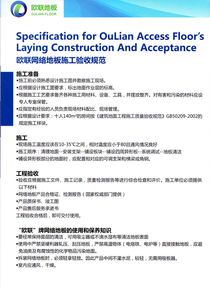 防靜電高架活動地板、全鋼地板、陶瓷地板是計算機行業(yè)發(fā)展起來的新型鋪地材料,隔離了潮氣、靜電灰塵,最重要的是解決了綜合布線問題,無需預埋管線,可隨時拆卸、搬移,保證了資訊設備完整的優(yōu)點,適應了智能化樓宇中信息自動化技術對所處環(huán)境的特定要求,避免了廣大客戶的雙重投資,使現代化辦公程度更加高效,辦公場所更加舒適。 “歐聯(lián)”系列全鋼地板,符合國家安全要求,種類完備多樣,其中防靜電陶瓷地板、硫酸鈣地板等除具有普通瓷質的裝飾和實用性外,其耐磨、防水、防火功能優(yōu)于其它同類產品,防靜電系列地板,能切合不同客戶的要求,其靈活的配置,深受客戶歡迎,不同材質的地板結構使設計師的設計空間比傳統(tǒng)的更加廣闊自由和善變。 公司大力發(fā)展國內外銷售業(yè)務,多次中標國內重點工程 ,例:哈爾濱醫(yī)科大學、山東大學、上海普通機場等。 公司將一如既往開發(fā)和制造一流的產品,愿與廣大有識之士合作發(fā)展,共創(chuàng)美好未來。